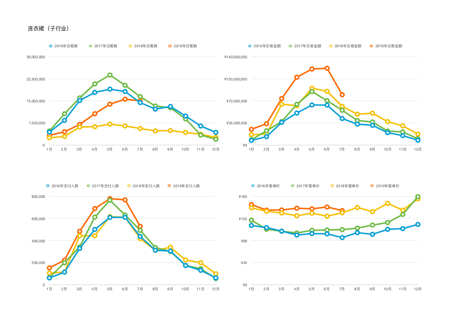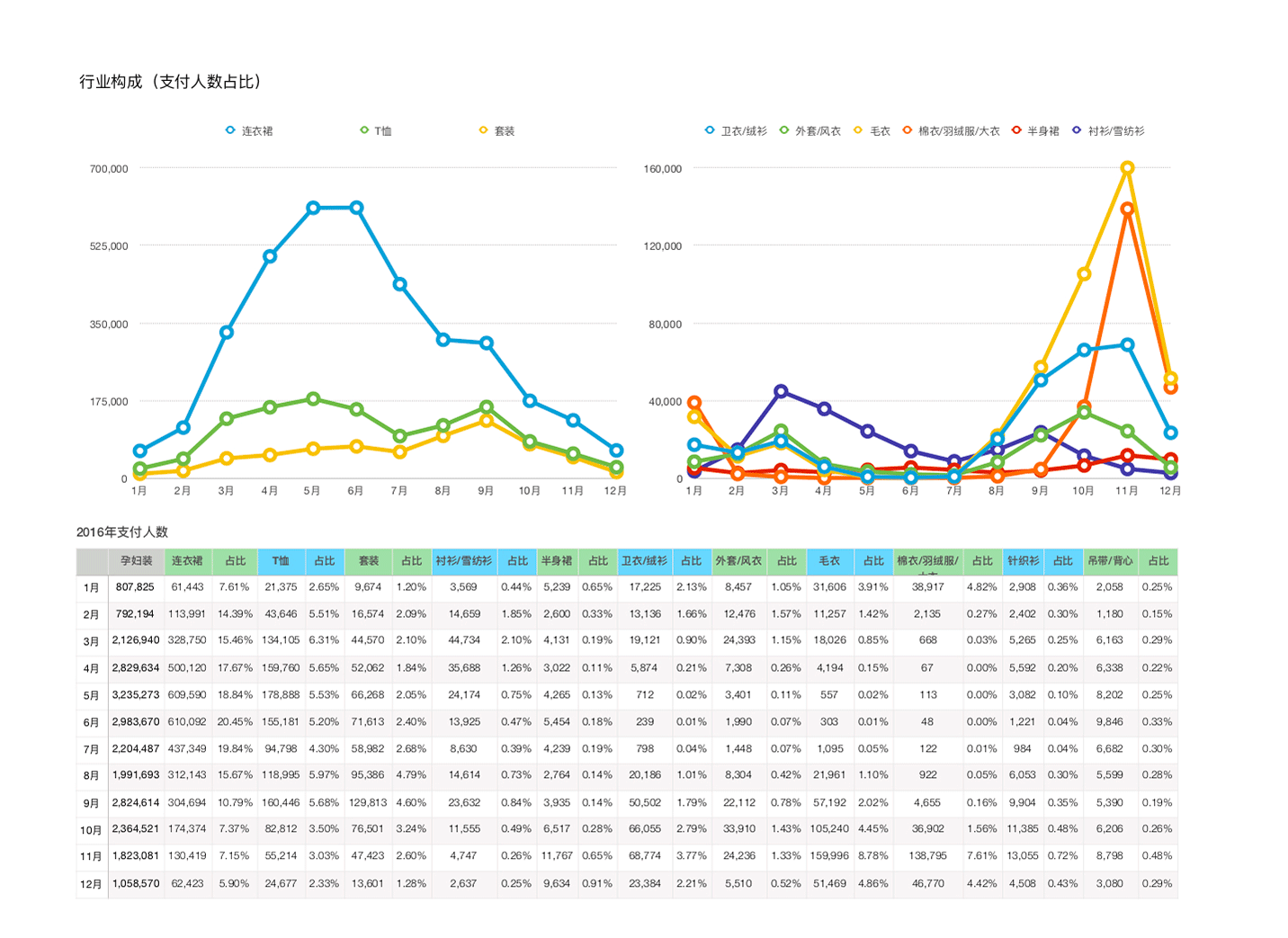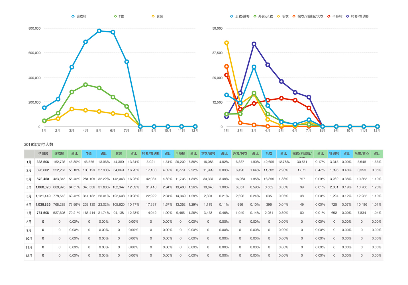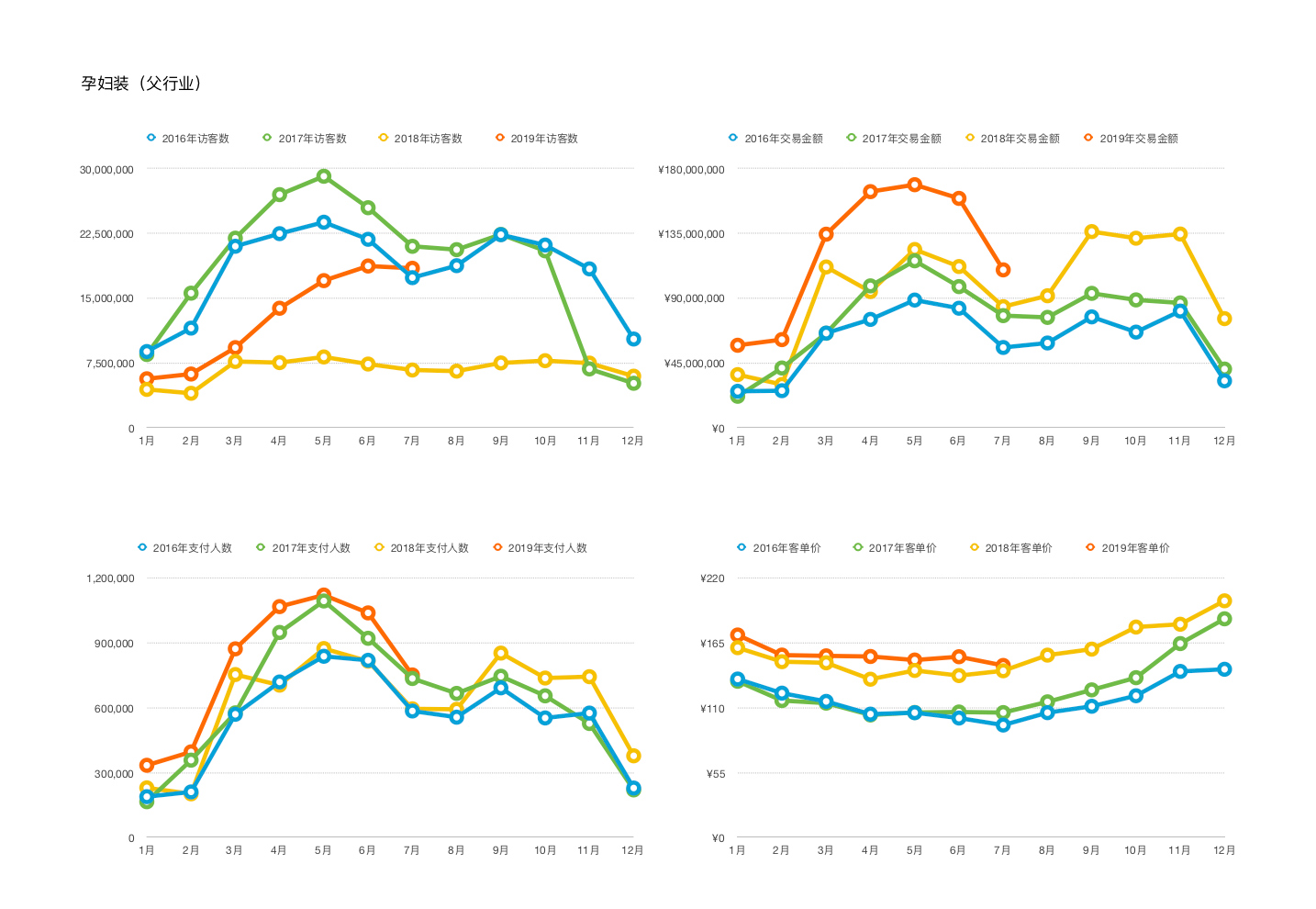 这是一份孕妇装类目市场大盘历年数据报表,包含2016、2017、2018、2019四年天猫数据,以及各子行业数据,如连衣裙、T恤、套装、衬衫、半身裙、卫衣、毛衣、棉衣、外套等,行业构成以交易金额占比、支付人数占比分别展示,数据截止至2019年7月,耗时一天完成,数据全部从生意参谋后台抓取,且经过指数转换,同时以图表的形式展示,让数据更直观!
