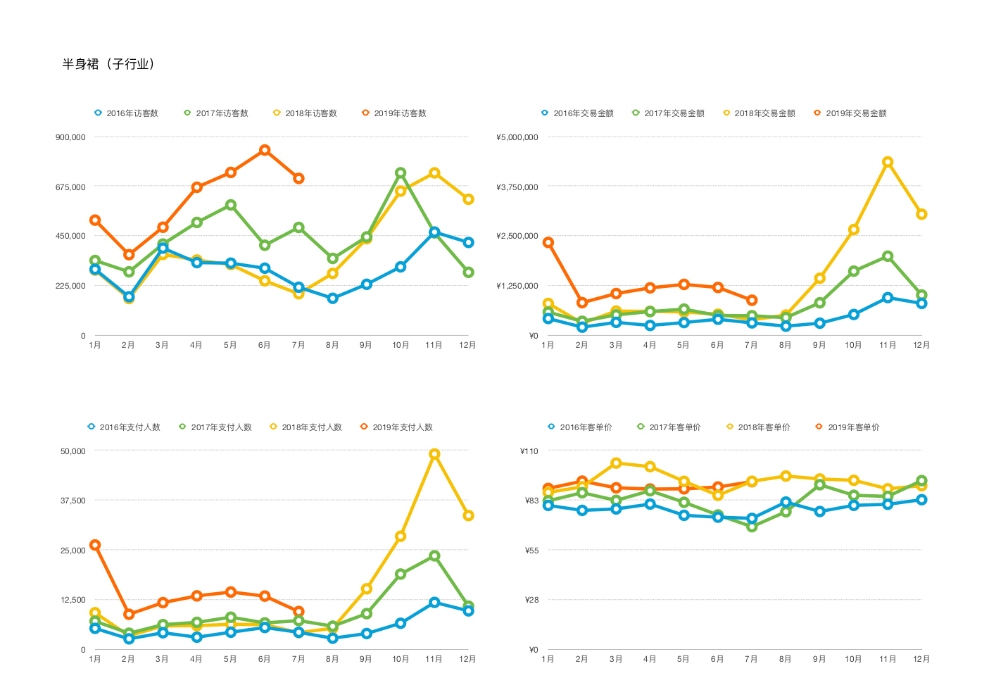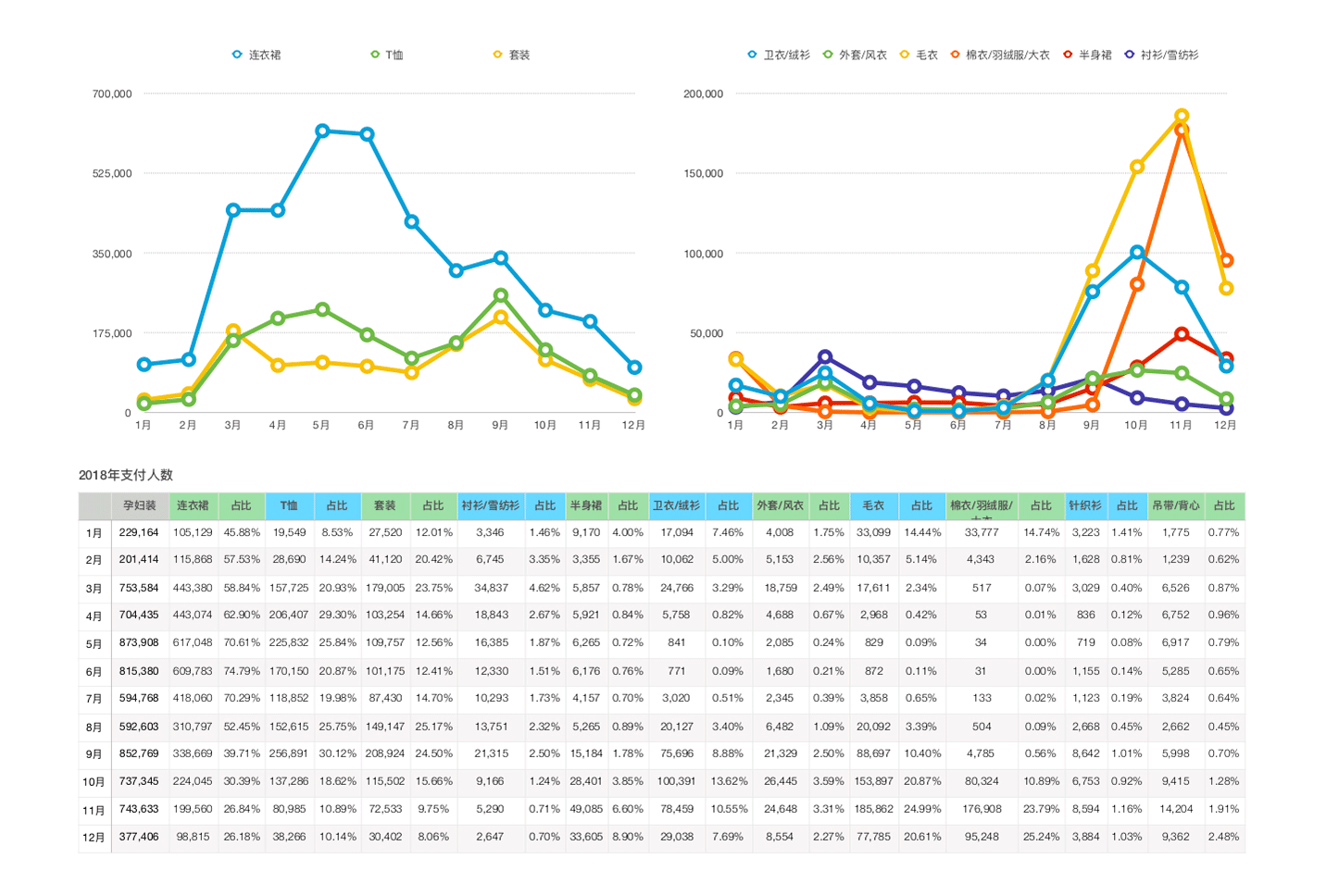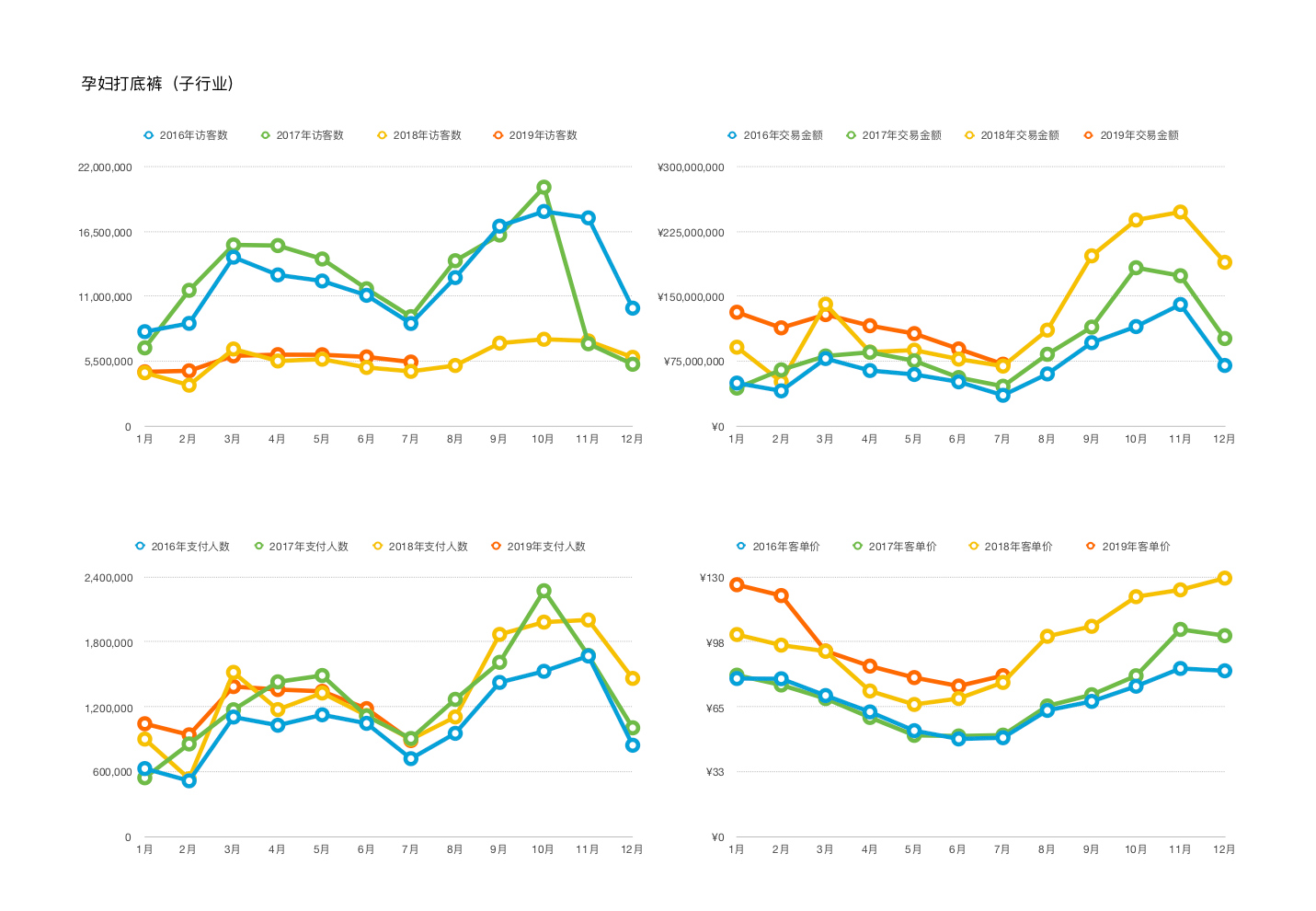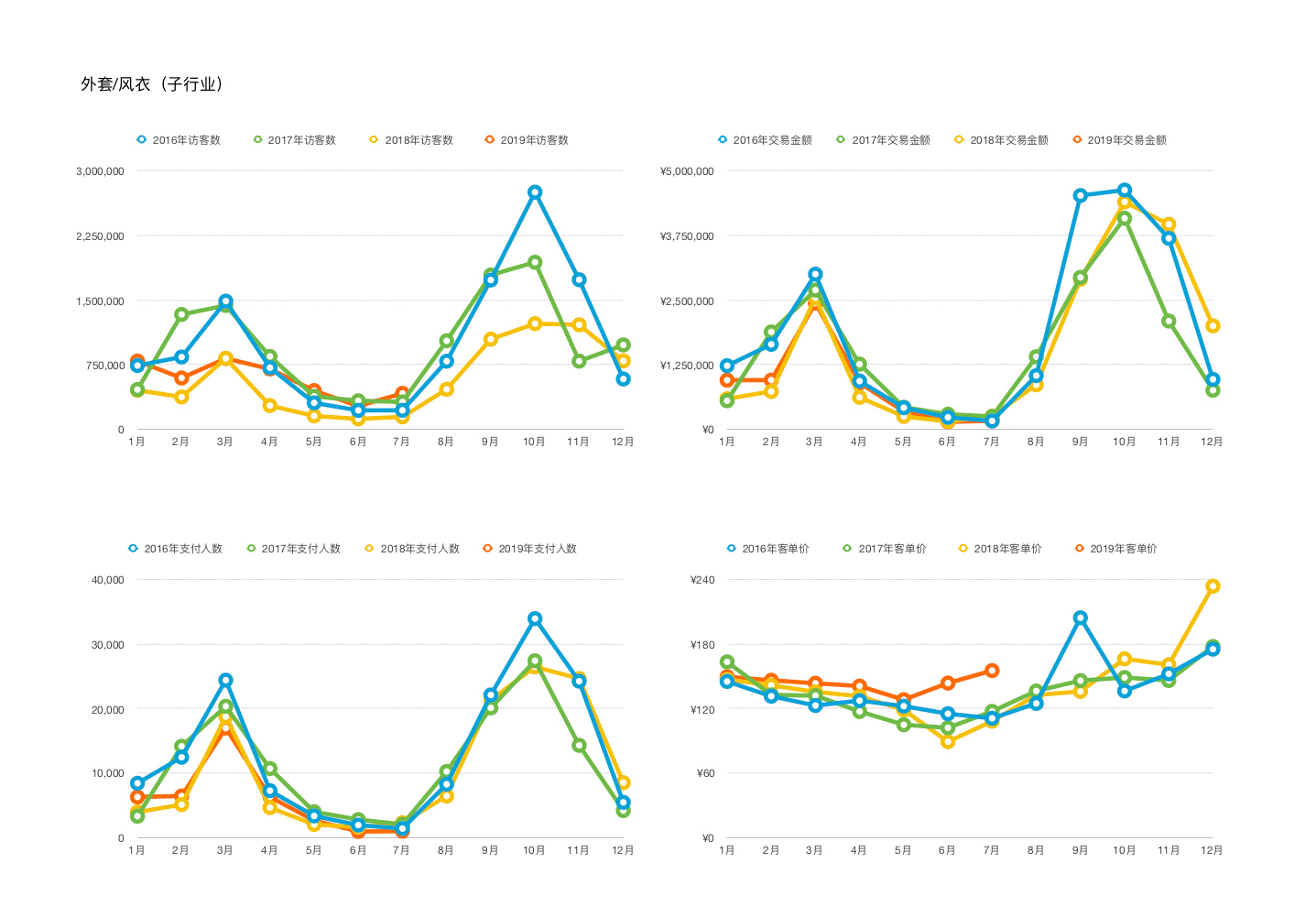 这是一份孕妇装类目市场大盘历年数据报表,包含2016、2017、2018、2019四年天猫数据,以及各子行业数据,如连衣裙、T恤、套装、衬衫、半身裙、卫衣、毛衣、棉衣、外套等,行业构成以交易金额占比、支付人数占比分别展示,数据截止至2019年7月,耗时一天完成,数据全部从生意参谋后台抓取,且经过指数转换,同时以图表的形式展示,让数据更直观!
