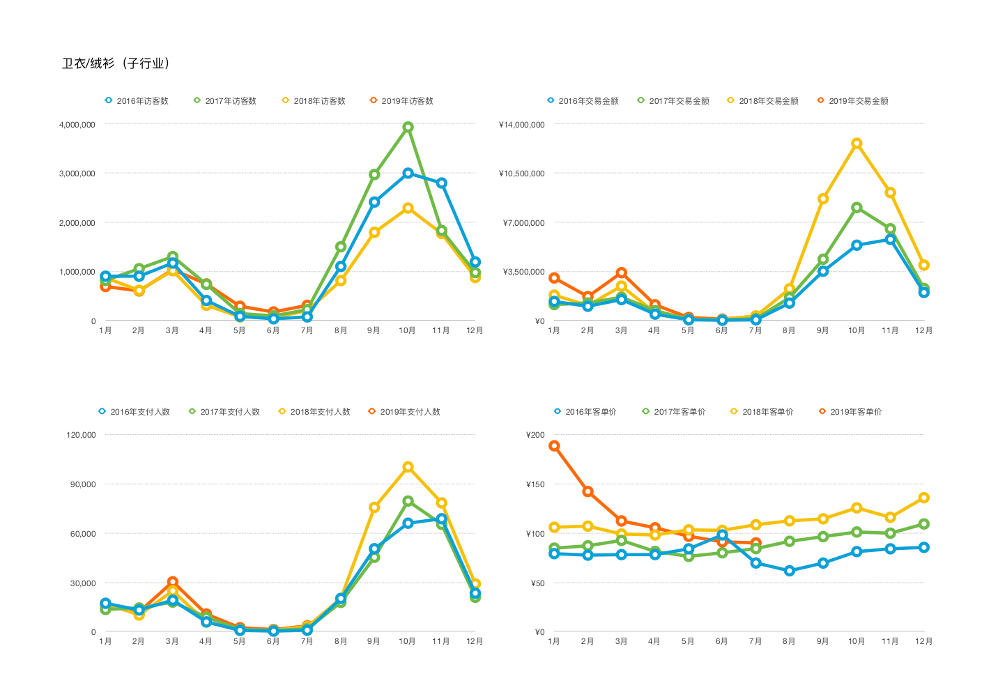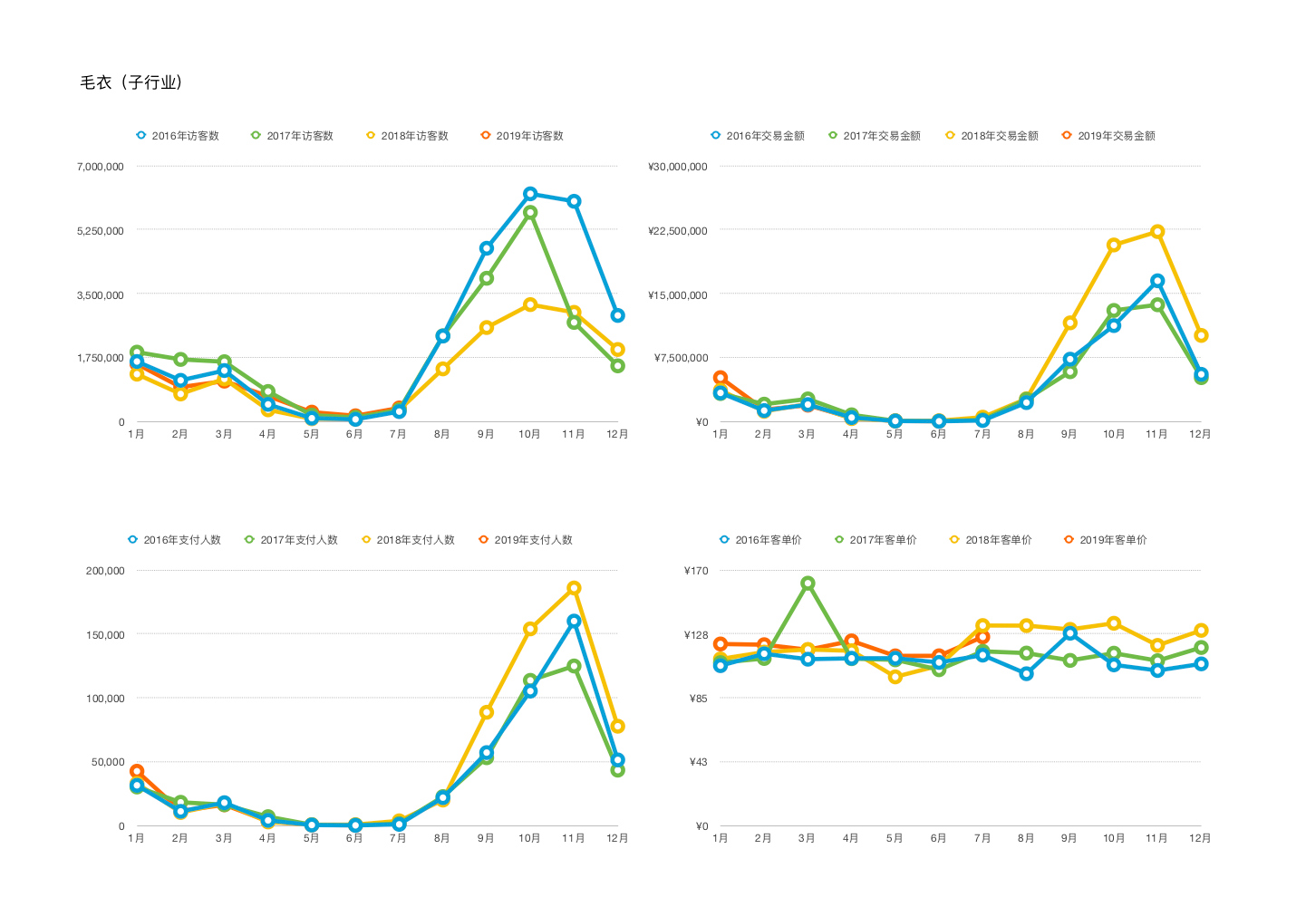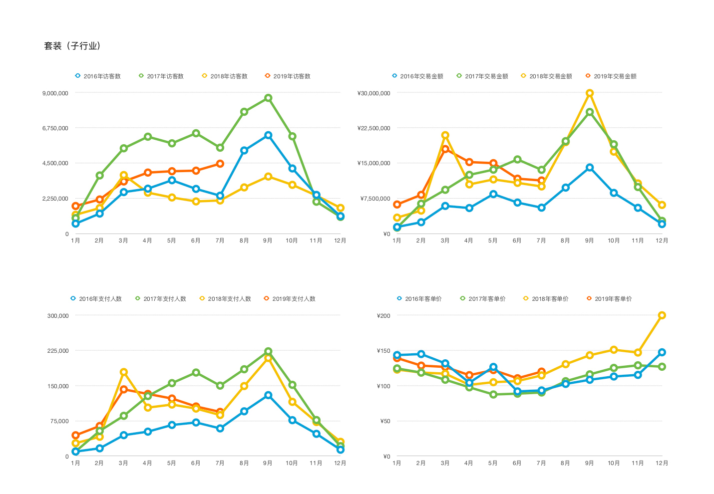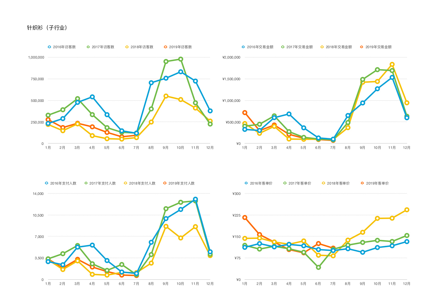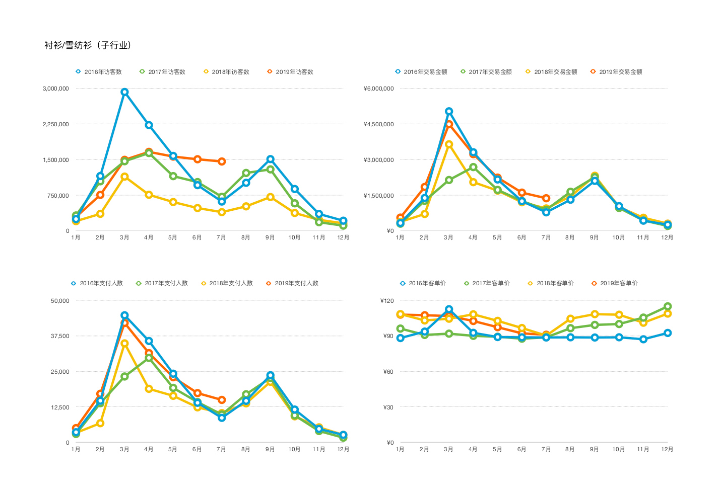 这是一份孕妇装类目市场大盘历年数据报表,包含2016、2017、2018、2019四年天猫数据,以及各子行业数据,如连衣裙、T恤、套装、衬衫、半身裙、卫衣、毛衣、棉衣、外套等,行业构成以交易金额占比、支付人数占比分别展示,数据截止至2019年7月,耗时一天完成,数据全部从生意参谋后台抓取,且经过指数转换,同时以图表的形式展示,让数据更直观!