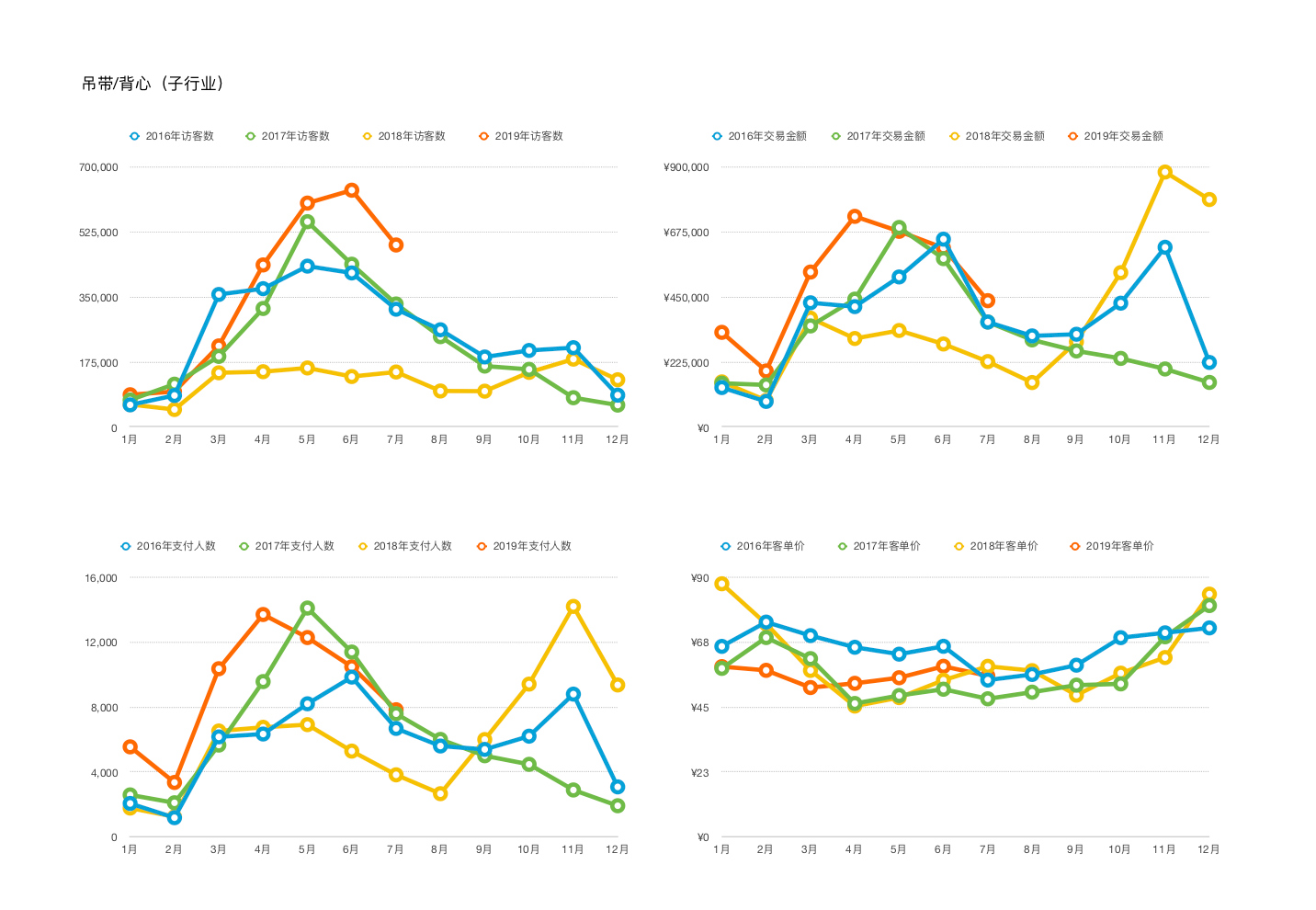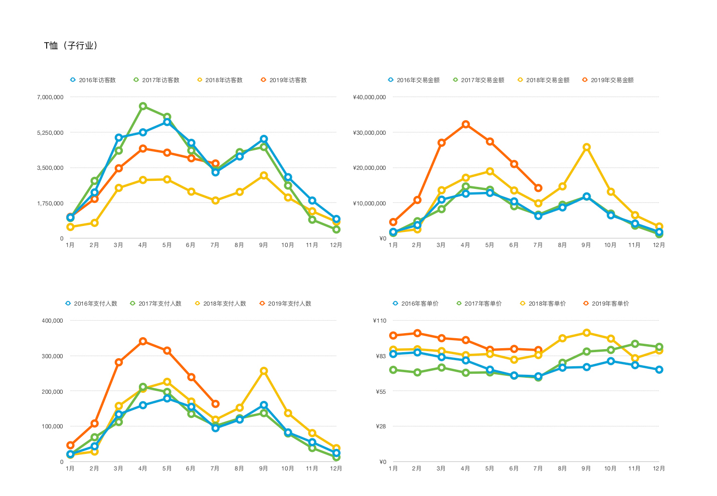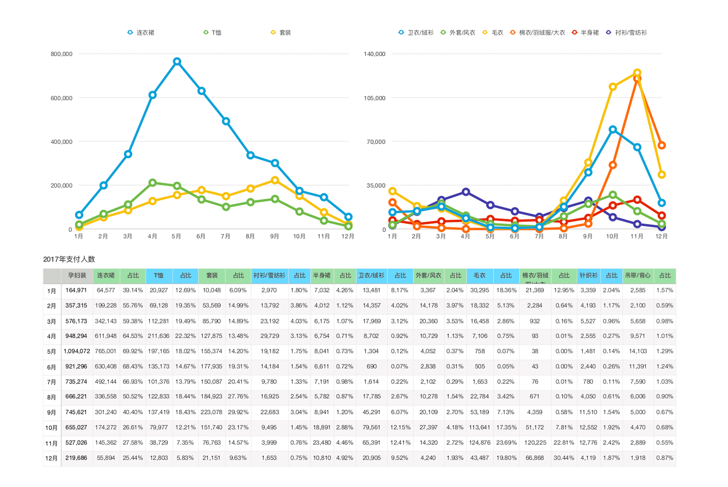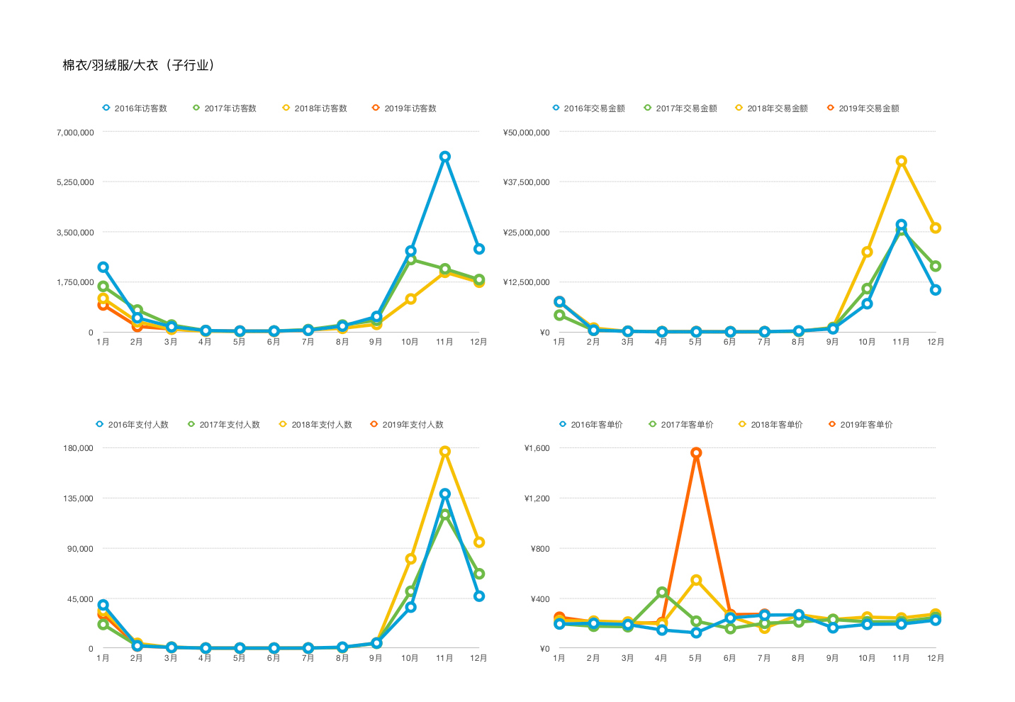 这是一份孕妇装类目市场大盘历年数据报表,包含2016、2017、2018、2019四年天猫数据,以及各子行业数据,如连衣裙、T恤、套装、衬衫、半身裙、卫衣、毛衣、棉衣、外套等,行业构成以交易金额占比、支付人数占比分别展示,数据截止至2019年7月,耗时一天完成,数据全部从生意参谋后台抓取,且经过指数转换,同时以图表的形式展示,让数据更直观!